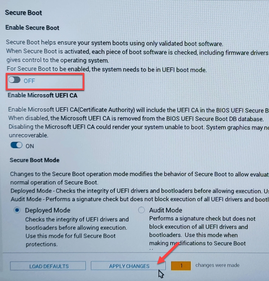 Secure Boot" et désactivez l'option "Enable Secure Boot". Cliquez ensuite sur "Apply Changes" pour enregistrer les modifications effectuées.